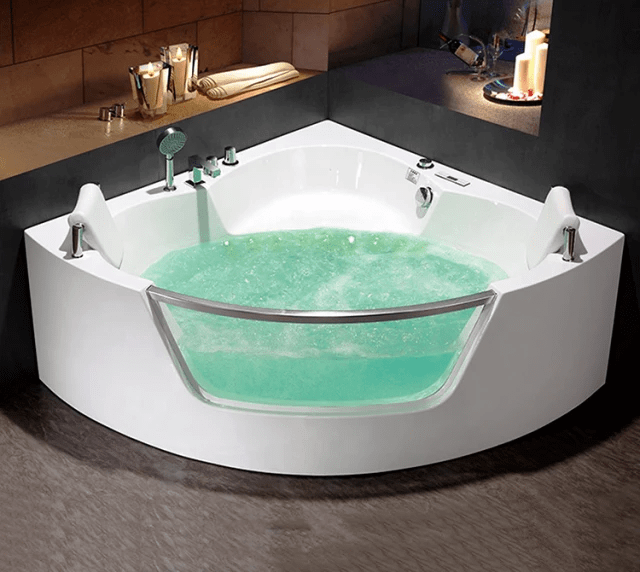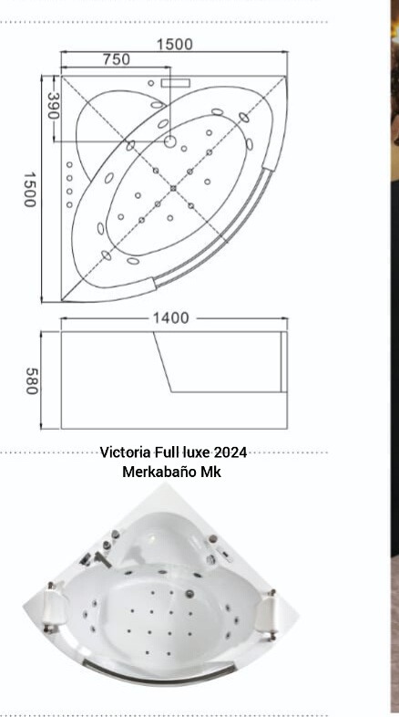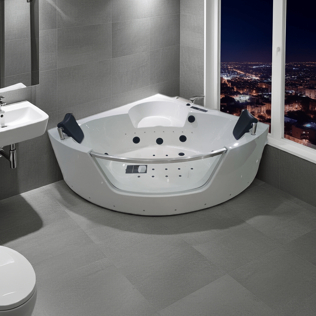 Bañera rincon cristal Victoria>Merkabaño MKBañera hidromasaje rincon con cristal y pasamanos acero inoxidable que le da seguridad y protege al cristal , La bañera de esquina Victoria forma parte de las novedades primavera 2025  FULL SYSTEM